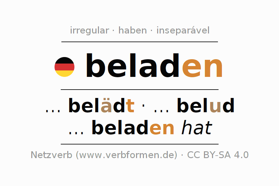 A conjugação do verbo beladen (carregar, encher) é irregular. As formas mais comuns são ... belädt, ... belud e ... beladen hat. A apofonia é feita com a vogal do radical a