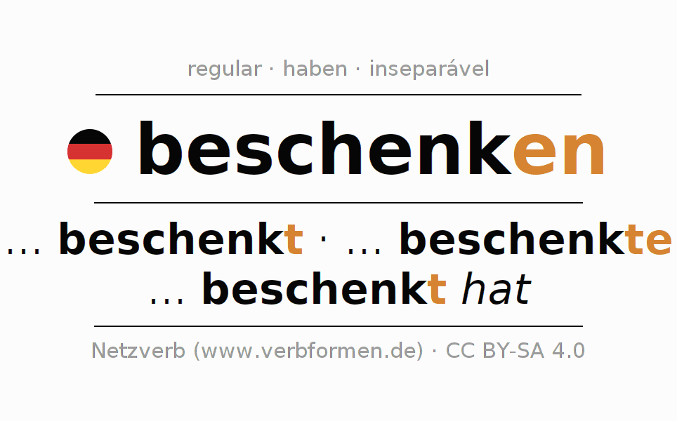 O prefixo be- de beschenken é inseparável. A flexão ocorre em Ativo e é usada como Oração subordinada. Para melhor compreensão estão disponíveis incontáveis. Exemplos do verbo beschenken . Para a prática e consolidação do estudo