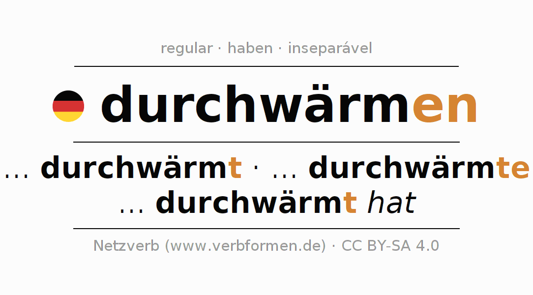 A conjugação do verbo durchwärmen (aquecimento, esquentar) é regular. As formas mais comuns são ... durchwärmt, ... durchwärmte e ... durchwärmt hat. O verbo auxilar para durchwärmen é "haben".