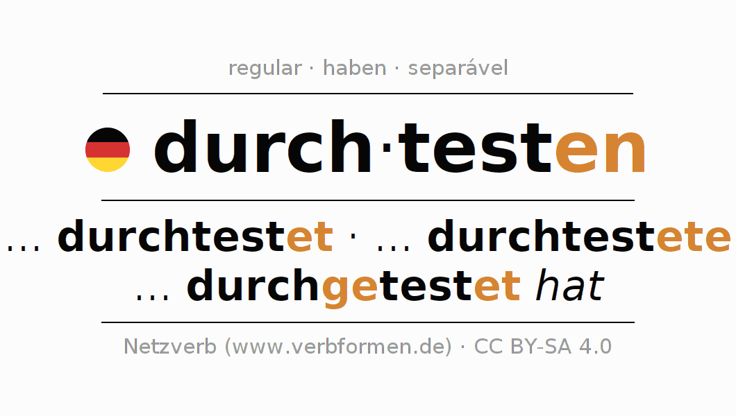 A conjugação do verbo durchtesten (examinar, testar) é regular. As formas mais comuns são ... durchtestet, ... durchtestete e ... durchgetestet hat. O verbo auxilar para durchtesten é "haben".