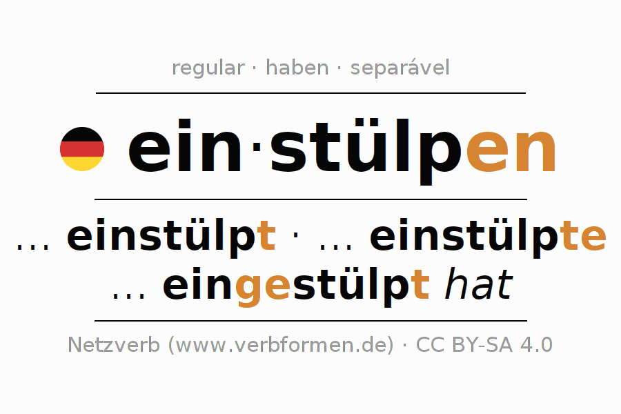 A conjugação do verbo einstülpen (dobrar para dentro, inverter) é regular. As formas mais comuns são ... einstülpt, ... einstülpte e ... eingestülpt hat. O verbo auxilar para einstülpen é "haben".