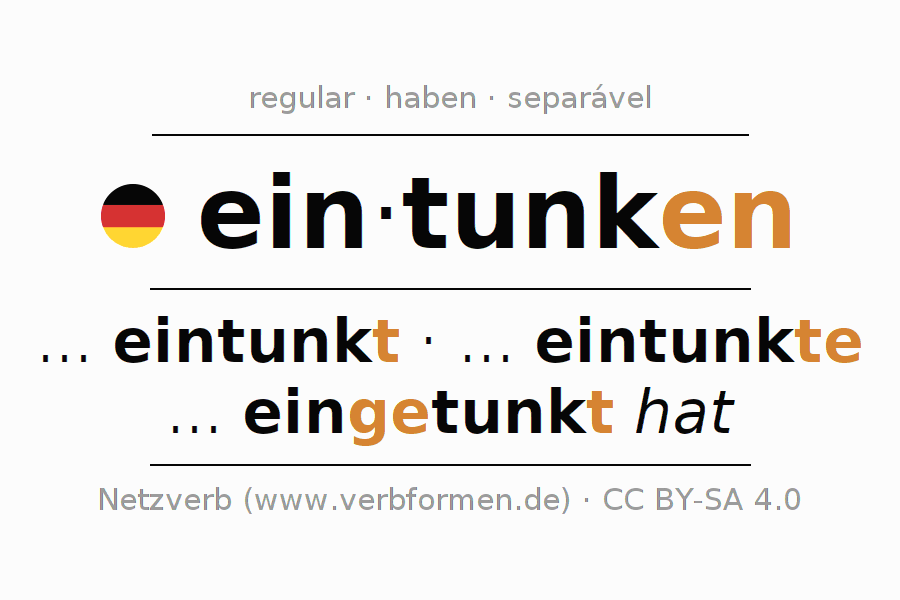 A conjugação do verbo eintunken (imersão, ensopar) é regular. As formas mais comuns são ... eintunkt, ... eintunkte e ... eingetunkt hat. O verbo auxilar para eintunken é "haben".