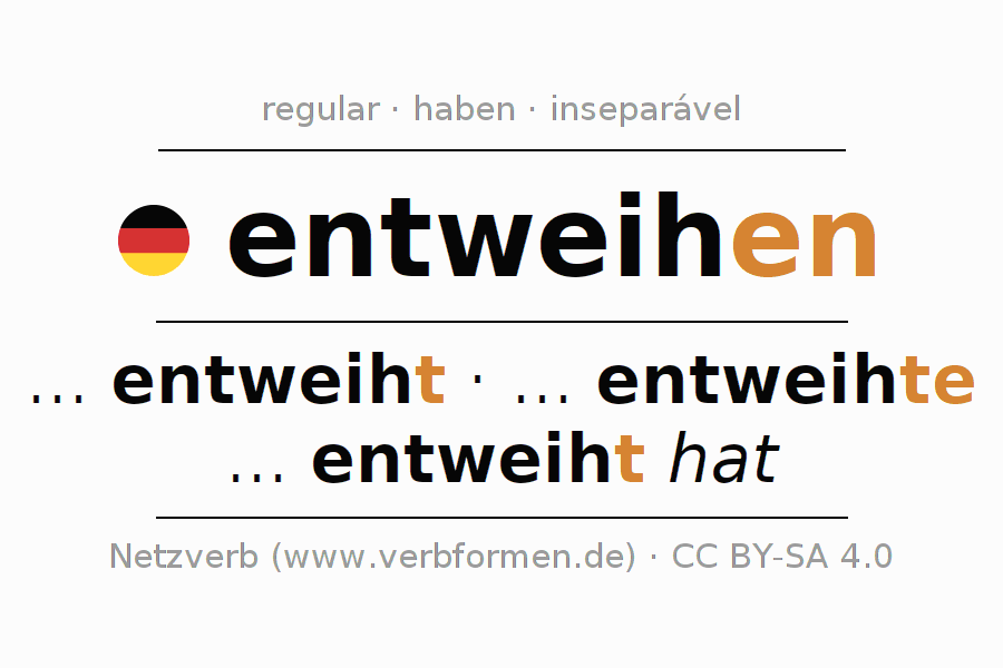 A conjugação do verbo entweihen (profanar, desacralizar) é regular. As formas mais comuns são ... entweiht, ... entweihte e ... entweiht hat. O verbo auxilar para entweihen é "haben".