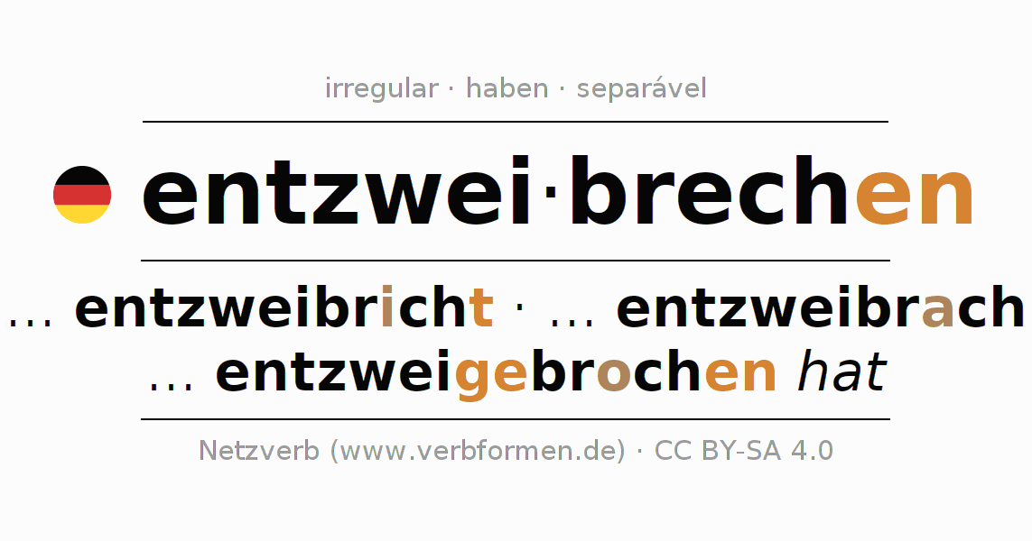 A conjugação do verbo entzweibrechen (partir, partir em pedaços) é irregular. As formas mais comuns são ... entzweibricht, ... entzweibrach e ... entzweigebrochen hat. A apofonia é feita com a vogal do radical e