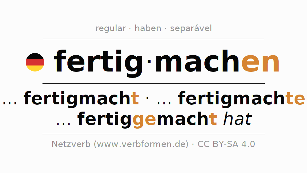 A conjugação do verbo fertig·machen é apresentada online assim como a Tabela de Verbo com todas as formas verbais no singular e no plural, e em todas as pessoas (1ª pessoa, 2ª pessoa, 3ª pessoa) A flexão do verbo fertig·machen é portanto, uma ajuda para os trabalhos de casa, testes, exames, aulas de alemão, para o estudo do alemão como língua estrangeira, como segunda língua e também na formação de adultos. Especialmente no aprendizado do alemão é importante a conjugação correta do verbo com as respectivamente formas flexionadas corretamente (... fertigmacht - ... fertigmachte - ... fertiggemacht hat). Mais informações podem ser encontradas no Wiktionary fertigmachen e no Duden fertigmachen.