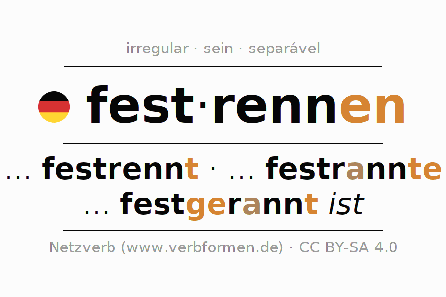 A conjugação do verbo fest·rennen é apresentada online assim como a Tabela de Verbo com todas as formas verbais no singular e no plural, e em todas as pessoas (1ª pessoa, 2ª pessoa, 3ª pessoa) A flexão do verbo fest·rennen é portanto, uma ajuda para os trabalhos de casa, testes, exames, aulas de alemão, para o estudo do alemão como língua estrangeira, como segunda língua e também na formação de adultos. Especialmente no aprendizado do alemão é importante a conjugação correta do verbo com as respectivamente formas flexionadas corretamente (... festrennt - ... festrannte - ... festgerannt ist). Mais informações podem ser encontradas no Wiktionary festrennen e no Duden festrennen.