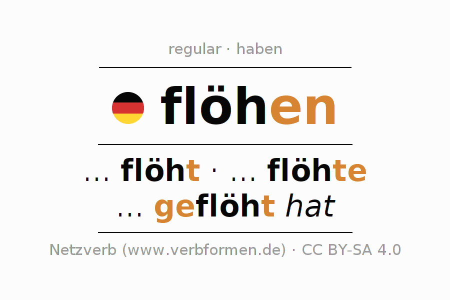 A conjugação do verbo flöhen (livrar de pulgas, revirar) é regular. As formas mais comuns são ... flöht, ... flöhte e ... geflöht hat. O verbo auxilar para flöhen é "haben".