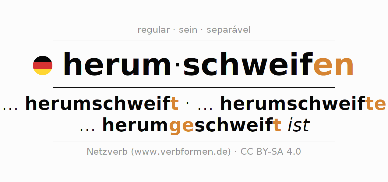 O prefixo herum - de herumschweifen é separável. A flexão ocorre em Ativo e é usada como Oração subordinada. Para melhor compreensão estão disponíveis incontáveis. Exemplos do verbo herumschweifen . Para a prática e consolidação do estudo