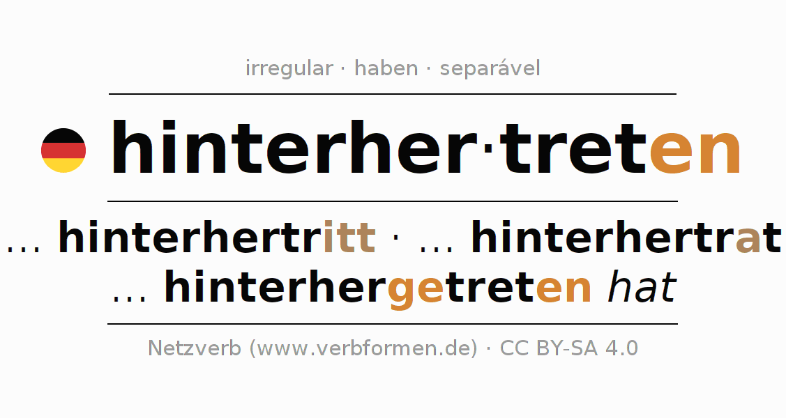 A conjugação do verbo hinterhertreten (chutar) é irregular. As formas mais comuns são ... hinterhertritt, ... hinterhertrat e ... hinterhergetreten hat. A apofonia é feita com a vogal do radical e