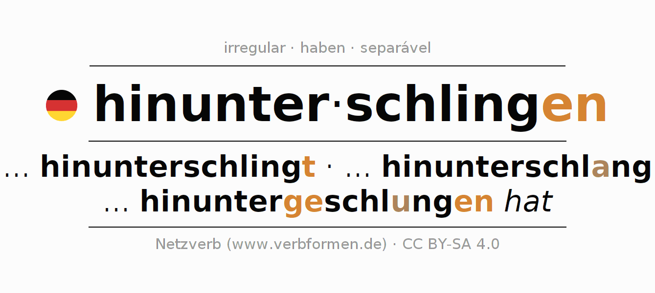 A conjugação do verbo hinunterschlingen (engolir, devorar) é irregular. As formas mais comuns são ... hinunterschlingt, ... hinunterschlang e ... hinuntergeschlungen hat. A apofonia é feita com a vogal do radical i
