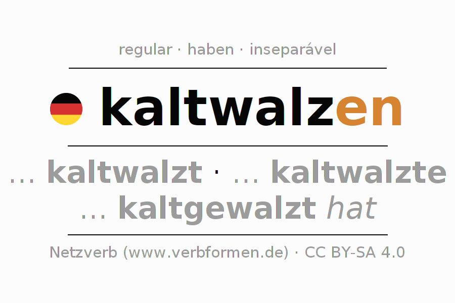O prefixo kalt- de kaltwalzen é inseparável. A flexão ocorre em Ativo e é usada como Oração subordinada. Para melhor compreensão estão disponíveis incontáveis. Exemplos do verbo kaltwalzen . Para a prática e consolidação do estudo
