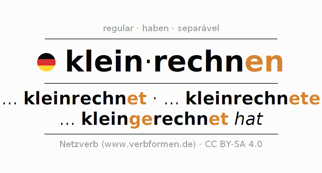 A conjugação do verbo kleinrechnen (minimizar, subestimar) é regular. As formas mais comuns são ... kleinrechnet, ... kleinrechnete e ... kleingerechnet hat. O verbo auxilar para kleinrechnen é "haben".