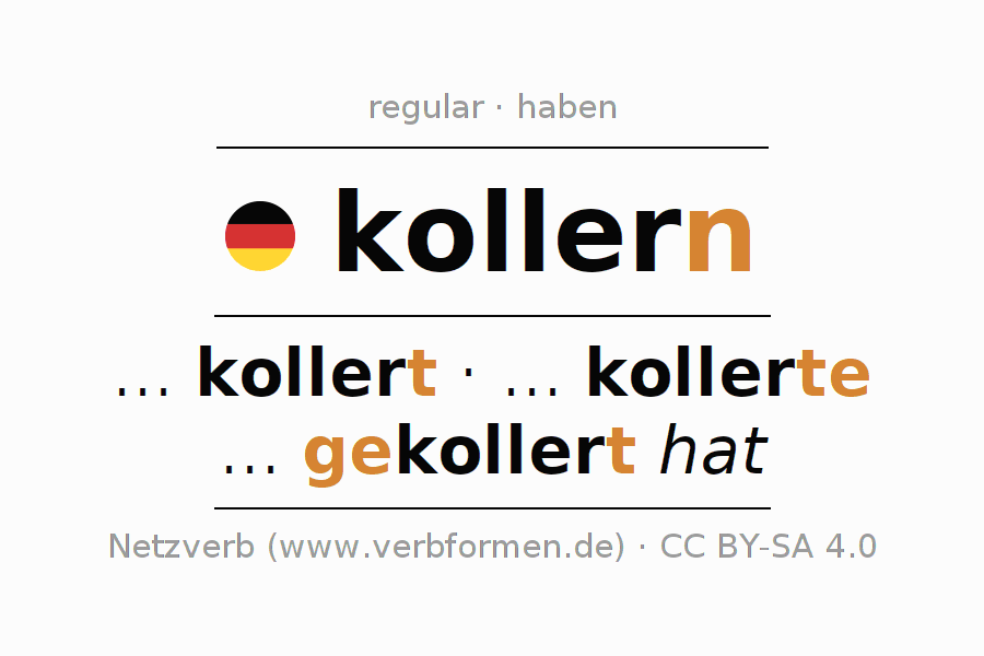A conjugação do verbo kollern (roncar, ataque de raiva) é regular. As formas mais comuns são ... kollert, ... kollerte e ... gekollert hat. O verbo auxilar para kollern é "haben". No entanto, há formas verbais com o verbo auxiliar " sein".