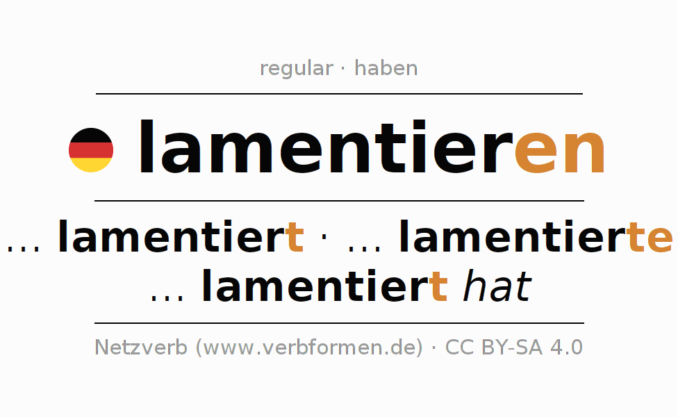 A conjugação do verbo lamentieren é apresentada online assim como a Tabela de Verbo com todas as formas verbais no singular e no plural, e em todas as pessoas (1ª pessoa, 2ª pessoa, 3ª pessoa) A flexão do verbo lamentieren é portanto, uma ajuda para os trabalhos de casa, testes, exames, aulas de alemão, para o estudo do alemão como língua estrangeira, como segunda língua e também na formação de adultos. Especialmente no aprendizado do alemão é importante a conjugação correta do verbo com as respectivamente formas flexionadas corretamente (... lamentiert - ... lamentierte - ... lamentiert hat). Mais informações podem ser encontradas no Wiktionary lamentieren e no Duden lamentieren.