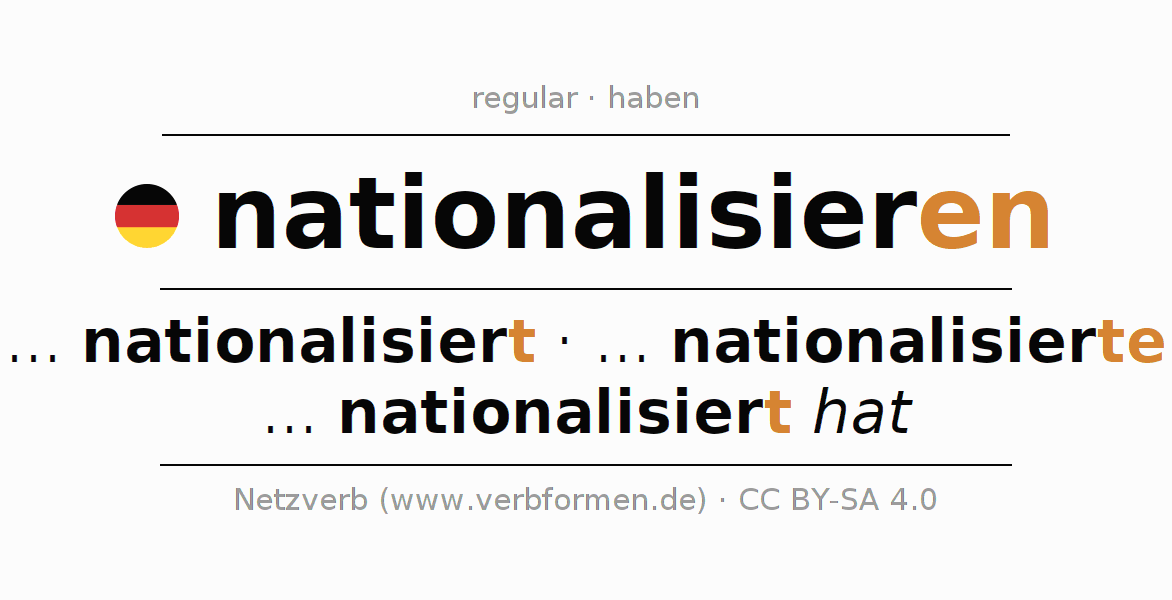A conjugação do verbo nationalisieren (nacionalizar) é regular. As formas mais comuns são ... nationalisiert, ... nationalisierte e ... nationalisiert hat. O verbo auxilar para nationalisieren é "haben".
