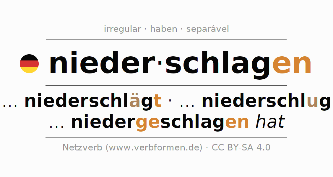 A conjugação do verbo niederschlagen (derrubar, abatir) é irregular. As formas mais comuns são ... niederschlägt, ... niederschlug e ... niedergeschlagen hat. A apofonia é feita com a vogal do radical a