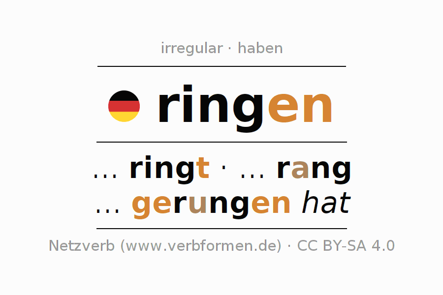 A conjugação do verbo ringen (lutar, debater) é irregular. As formas mais comuns são ... ringt, ... rang e ... gerungen hat. A apofonia é feita com a vogal do radical i