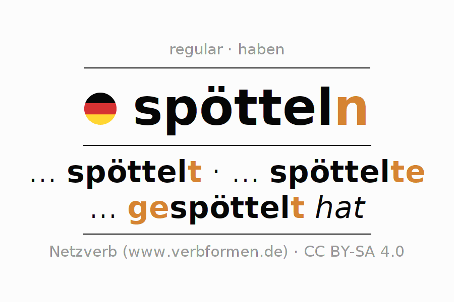 A conjugação do verbo spötteln (ridicularizar, troçar de) é regular. As formas mais comuns são ... spöttelt, ... spöttelte e ... gespöttelt hat. O verbo auxilar para spötteln é "haben".