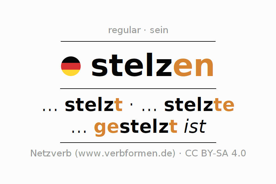 A conjugação do verbo stelzen (andar com passos longos, andar em pernas de pau) é regular. As formas mais comuns são ... stelzt, ... stelzte e ... gestelzt ist. O verbo auxilar para stelzen é "sein".