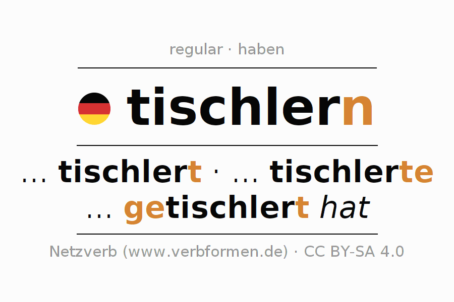 A conjugação do verbo tischlern (marcenaria, carpintaria) é regular. As formas mais comuns são ... tischlert, ... tischlerte e ... getischlert hat. O verbo auxilar para tischlern é "haben".
