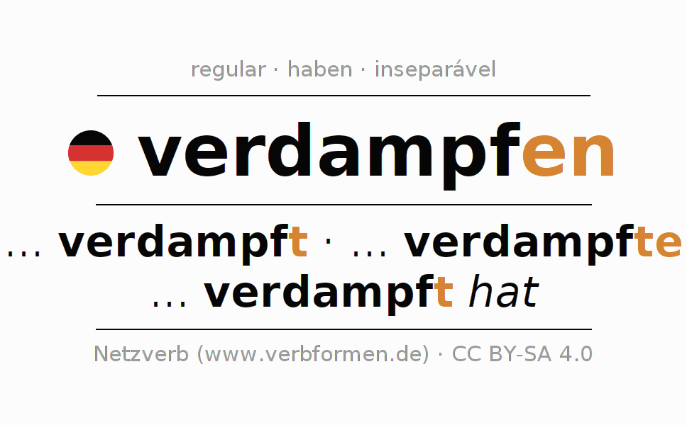 O prefixo ver- de verdampfen é inseparável. A flexão ocorre em Ativo e é usada como Oração subordinada. Para melhor compreensão estão disponíveis incontáveis. Exemplos do verbo verdampfen . Para a prática e consolidação do estudo