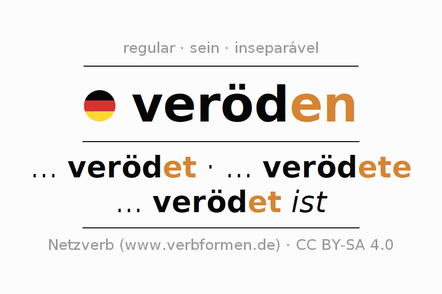 A conjugação do verbo veröden (ficar deserto, ficar despovoado) é regular. As formas mais comuns são ... verödet, ... verödete e ... verödet ist. O verbo auxilar para veröden é "sein". No entanto, há formas verbais com o verbo auxiliar " haben".