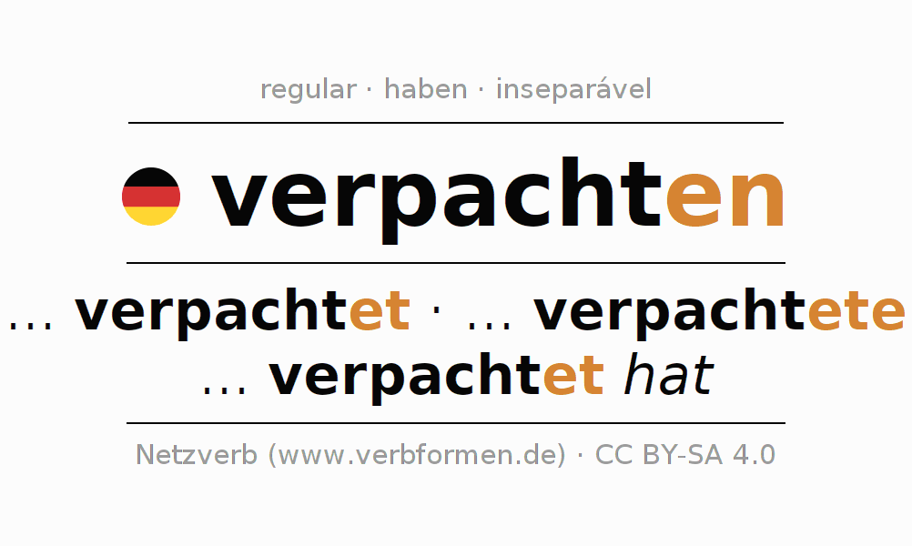 A conjugação do verbo verpachten (arrendar, locar) é regular. As formas mais comuns são ... verpachtet, ... verpachtete e ... verpachtet hat. O verbo auxilar para verpachten é "haben".