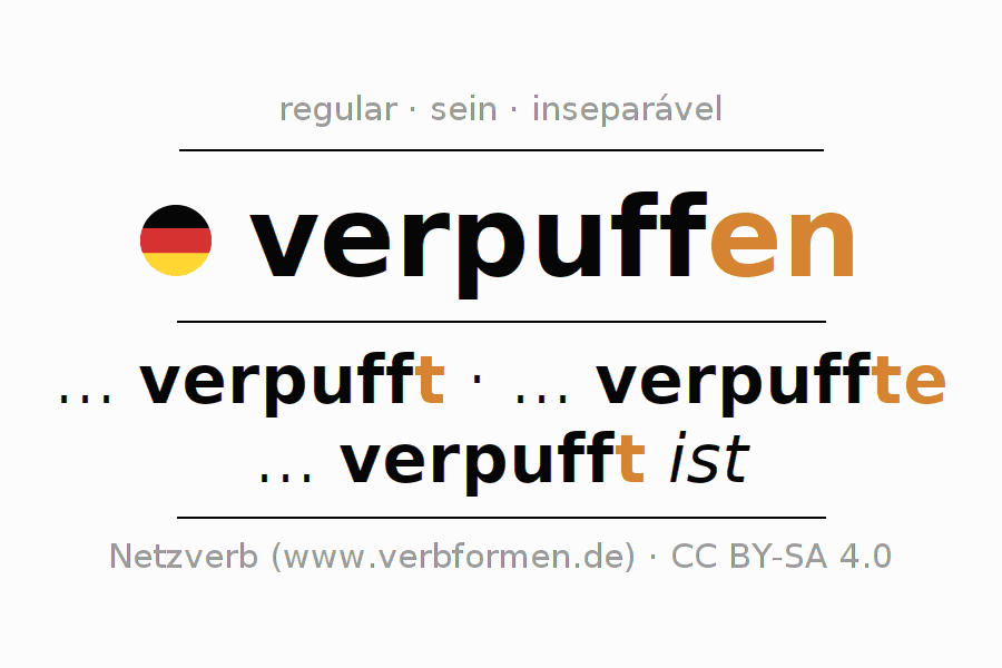 A conjugação do verbo verpuffen (deflagrar, desaparecer) é regular. As formas mais comuns são ... verpufft, ... verpuffte e ... verpufft ist. O verbo auxilar para verpuffen é "sein".