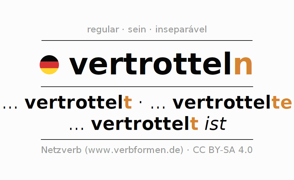 A conjugação do verbo vertrotteln é apresentada online assim como a Tabela de Verbo com todas as formas verbais no singular e no plural, e em todas as pessoas (1ª pessoa, 2ª pessoa, 3ª pessoa) A flexão do verbo vertrotteln é portanto, uma ajuda para os trabalhos de casa, testes, exames, aulas de alemão, para o estudo do alemão como língua estrangeira, como segunda língua e também na formação de adultos. Especialmente no aprendizado do alemão é importante a conjugação correta do verbo com as respectivamente formas flexionadas corretamente (... vertrottelt - ... vertrottelte - ... vertrottelt ist). Mais informações podem ser encontradas no Wiktionary vertrotteln e no Duden vertrotteln.