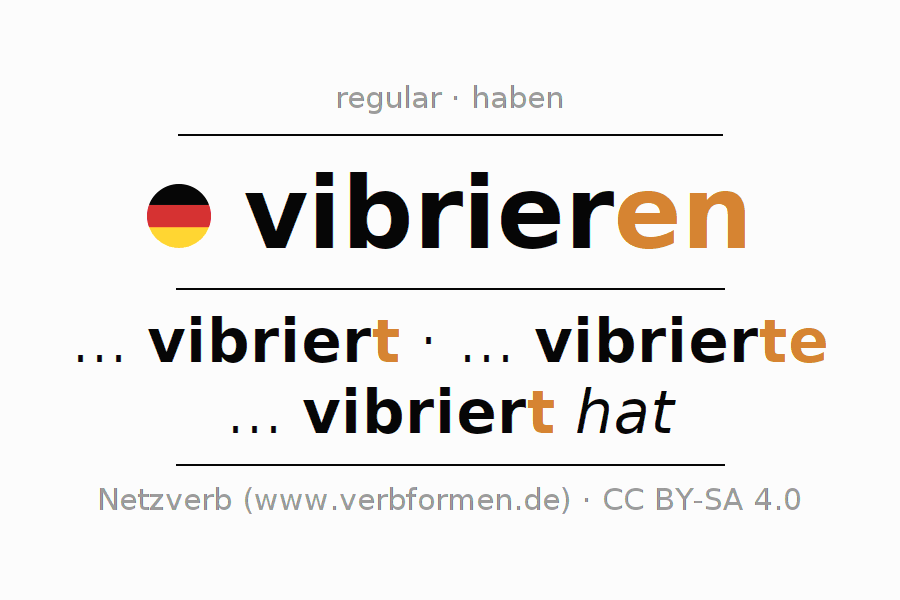 A conjugação do verbo vibrieren (vibrar, tremer) é regular. As formas mais comuns são ... vibriert, ... vibrierte e ... vibriert hat. O verbo auxilar para vibrieren é "haben".