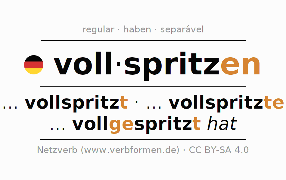 A conjugação do verbo voll·spritzen é apresentada online assim como a Tabela de Verbo com todas as formas verbais no singular e no plural, e em todas as pessoas (1ª pessoa, 2ª pessoa, 3ª pessoa) A flexão do verbo voll·spritzen é portanto, uma ajuda para os trabalhos de casa, testes, exames, aulas de alemão, para o estudo do alemão como língua estrangeira, como segunda língua e também na formação de adultos. Especialmente no aprendizado do alemão é importante a conjugação correta do verbo com as respectivamente formas flexionadas corretamente (... vollspritzt - ... vollspritzte - ... vollgespritzt hat). Mais informações podem ser encontradas no Wiktionary vollspritzen e no Duden vollspritzen.