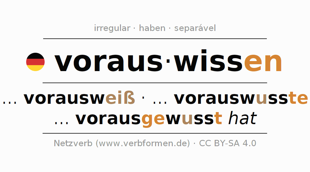 A conjugação do verbo vorauswissen (prever, saber antecipadamente) é irregular. As formas mais comuns são ... vorausweiß, ... vorauswusste e ... vorausgewusst hat. O verbo auxilar para vorauswissen é "haben".