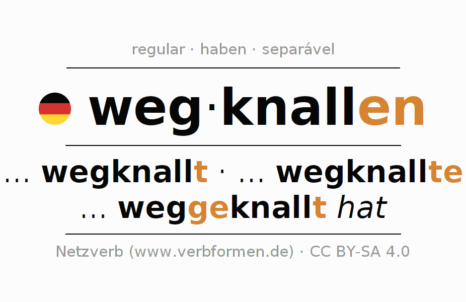A conjugação do verbo weg·knallen é apresentada online assim como a Tabela de Verbo com todas as formas verbais no singular e no plural, e em todas as pessoas (1ª pessoa, 2ª pessoa, 3ª pessoa) A flexão do verbo weg·knallen é portanto, uma ajuda para os trabalhos de casa, testes, exames, aulas de alemão, para o estudo do alemão como língua estrangeira, como segunda língua e também na formação de adultos. Especialmente no aprendizado do alemão é importante a conjugação correta do verbo com as respectivamente formas flexionadas corretamente (... wegknallt - ... wegknallte - ... weggeknallt hat). Mais informações podem ser encontradas no Wiktionary wegknallen e no Duden wegknallen.