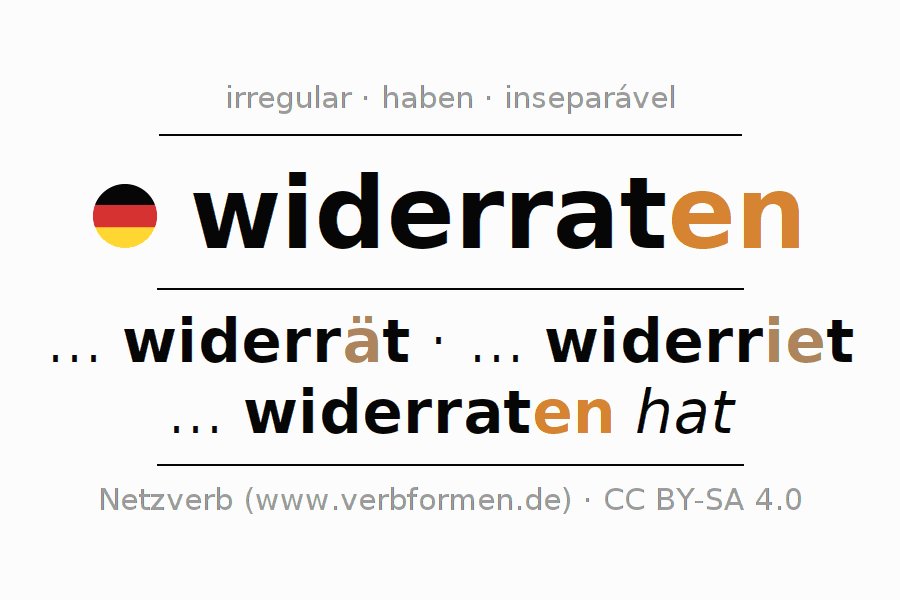 A conjugação do verbo widerraten é apresentada online assim como a Tabela de Verbo com todas as formas verbais no singular e no plural, e em todas as pessoas (1ª pessoa, 2ª pessoa, 3ª pessoa) A flexão do verbo widerraten é portanto, uma ajuda para os trabalhos de casa, testes, exames, aulas de alemão, para o estudo do alemão como língua estrangeira, como segunda língua e também na formação de adultos. Especialmente no aprendizado do alemão é importante a conjugação correta do verbo com as respectivamente formas flexionadas corretamente (... widerrät - ... widerriet - ... widerraten hat). Mais informações podem ser encontradas no Wiktionary widerraten e no Duden widerraten.