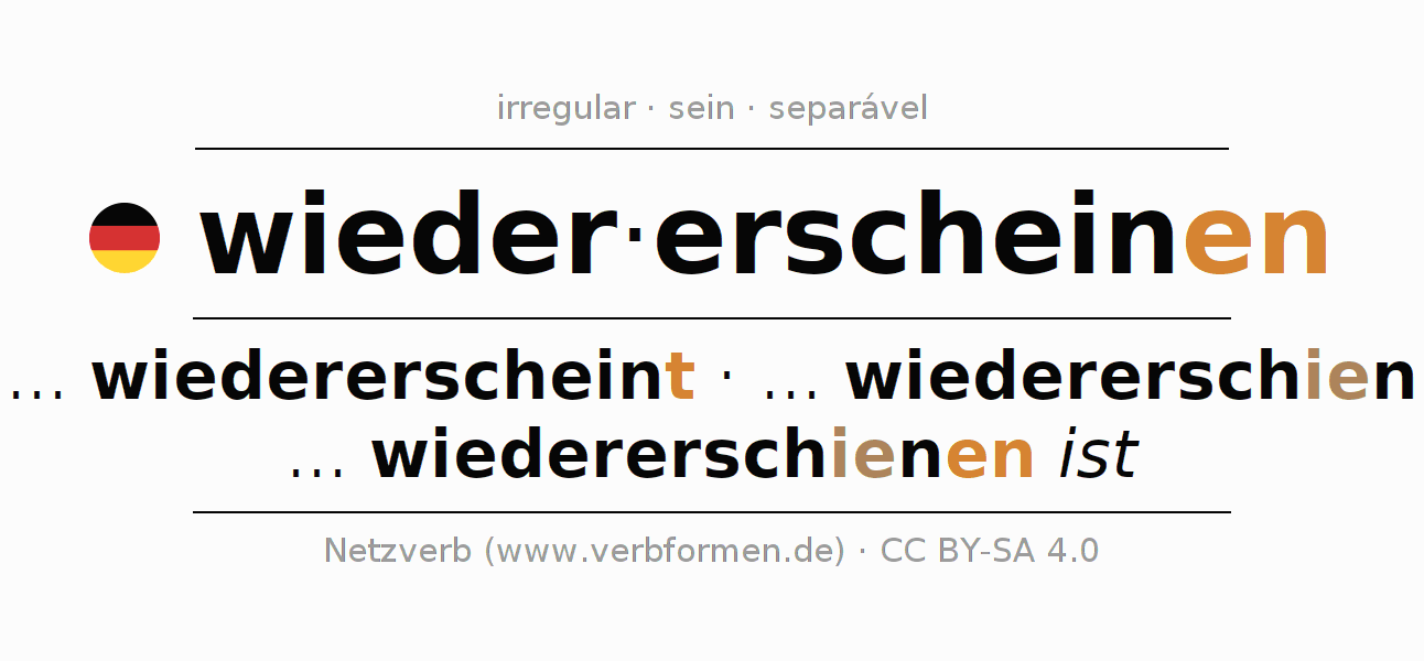A conjugação do verbo wiedererscheinen (reaparecer, voltar a aparecer) é irregular. As formas mais comuns são ... wiedererscheint, ... wiedererschien e ... wiedererschienen ist. A apofonia é feita com a vogal do radical ei