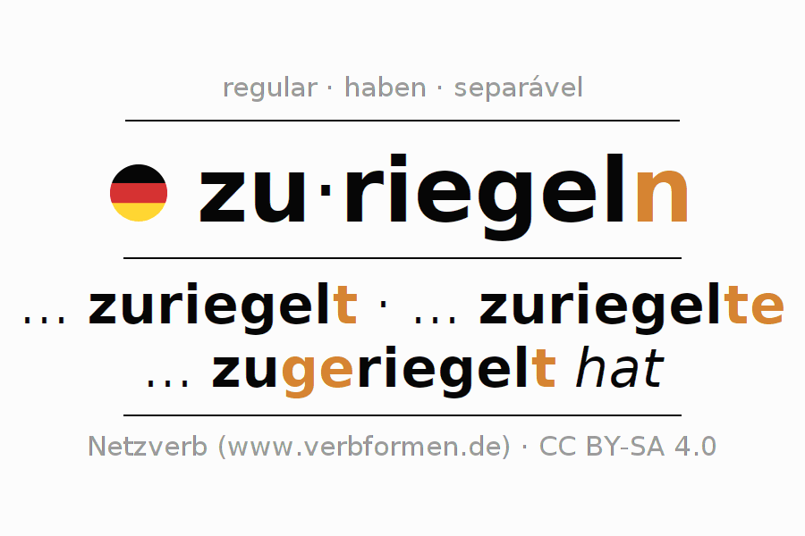 A conjugação do verbo zuriegeln (fechar, fechar com segurança) é regular. As formas mais comuns são ... zuriegelt, ... zuriegelte e ... zugeriegelt hat. O verbo auxilar para zuriegeln é "haben".