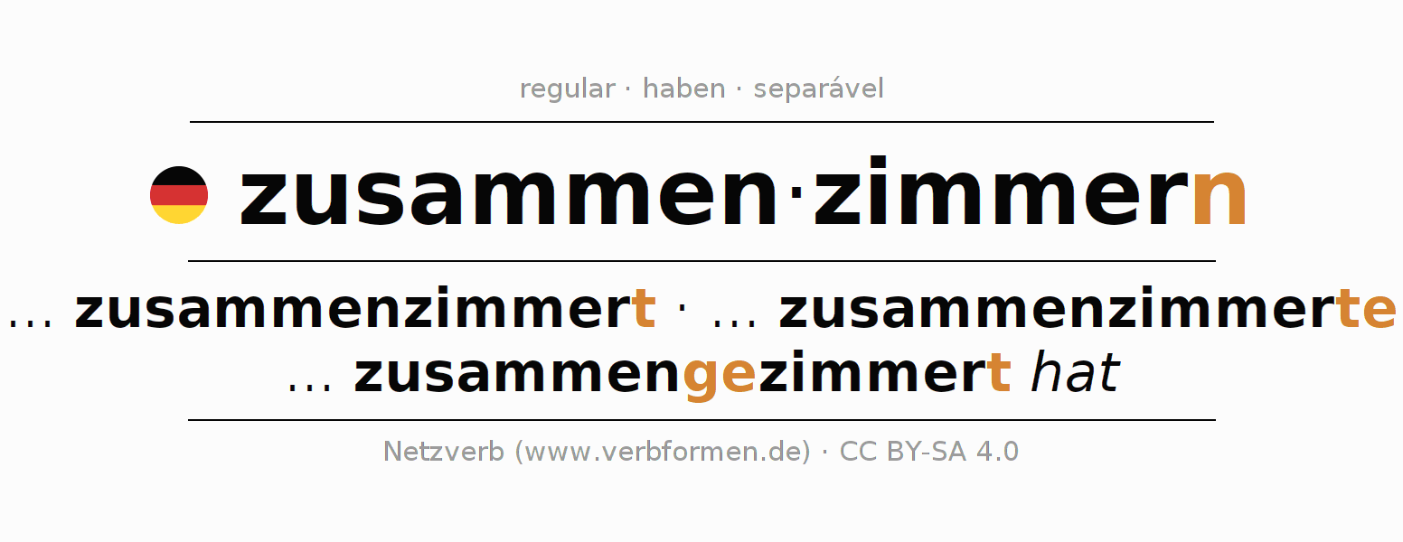 O prefixo zusammen - de zusammenzimmern é separável. A flexão ocorre em Ativo e é usada como Oração subordinada. Para melhor compreensão estão disponíveis incontáveis. Exemplos do verbo zusammenzimmern . Para a prática e consolidação do estudo