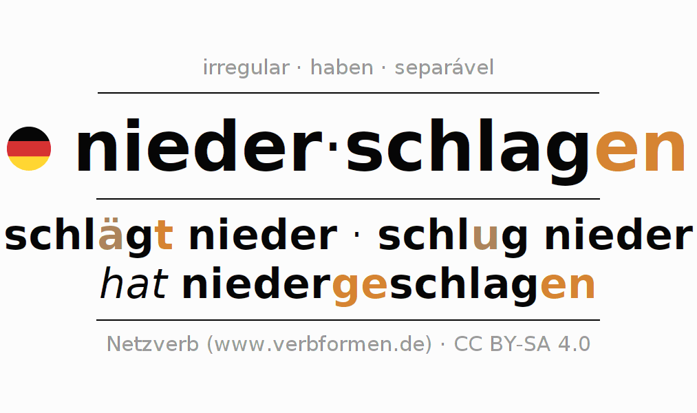 A conjugação do verbo niederschlagen (derrubar, abatir) é irregular. As formas mais comuns são schlägt nieder, schlug nieder e hat niedergeschlagen. A apofonia é feita com a vogal do radical a