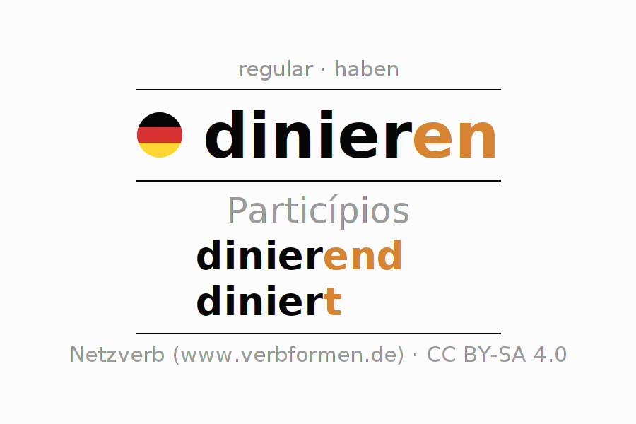 As formas do particípio para o verbo dinieren (jantar, almoço festivo) são: dinierend, diniert