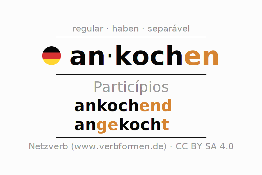 A conjugação do verbo ankochen no Ativo Particípio Presente Perfeito palavra discurso é: ankochend, angekocht.A formação dessas formas segue determinadas regras gramaticais. Os requisitos para a conjugação do verbo como forma verbal simples no ankochen do Particípio. Comentários ☆