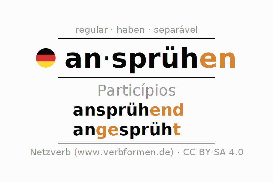 A conjugação do verbo ansprühen no Ativo Particípio Presente Perfeito palavra discurso é: ansprühend, angesprüht.A formação dessas formas segue determinadas regras gramaticais. Os requisitos para a conjugação do verbo como forma verbal simples no ansprühen do Particípio. Comentários ☆