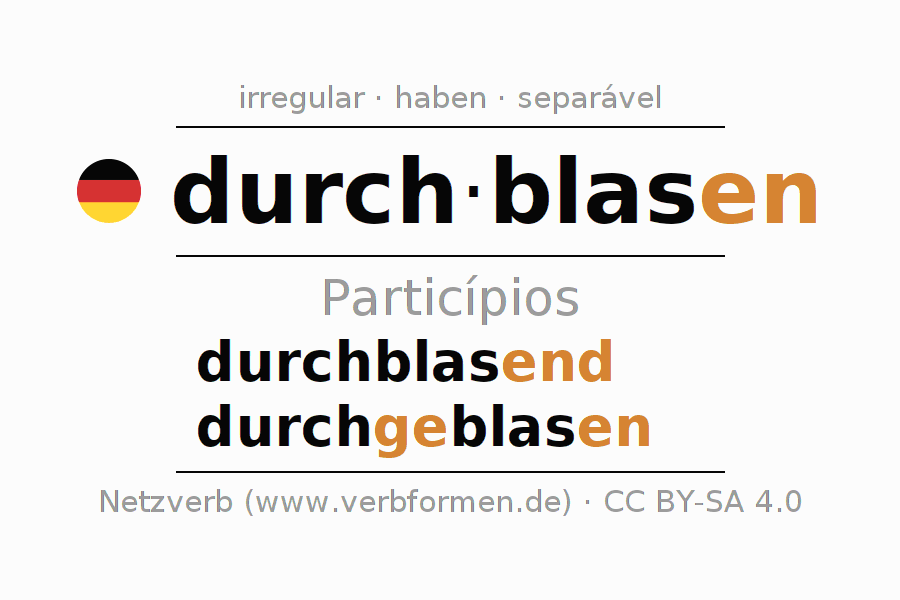 A conjugação do verbo durchblasen no Ativo Particípio Presente Perfeito palavra discurso é: durchblasend, durchgeblasen.A formação dessas formas segue determinadas regras gramaticais. Os requisitos para a conjugação do verbo como forma verbal simples no durchblasen do Particípio. Comentários ☆