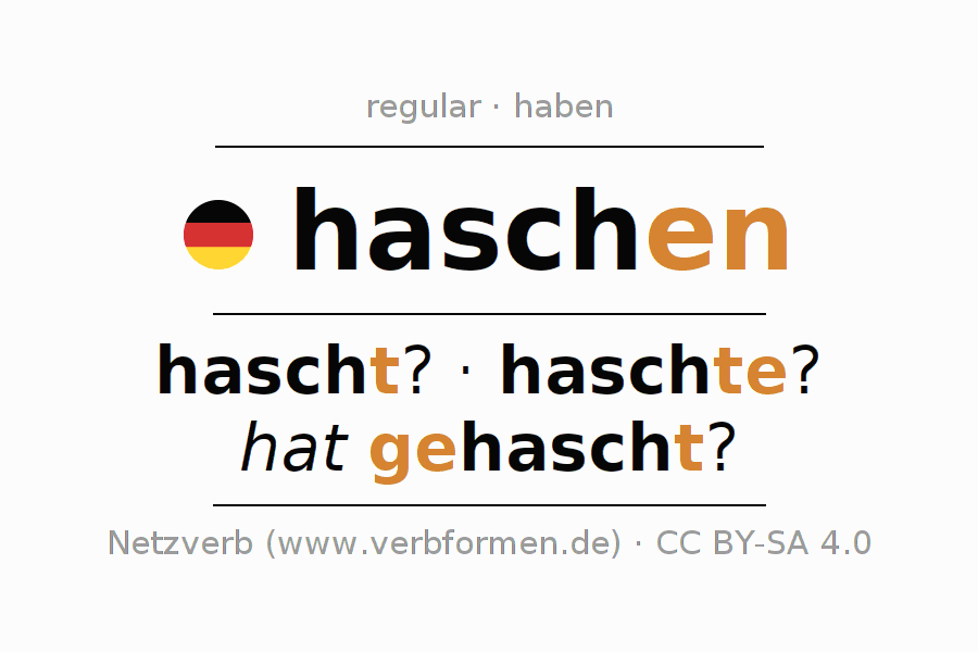 A conjugação do verbo haschen no Ativo Particípio Presente Perfeito palavra discurso é: haschend, gehascht.A formação dessas formas segue determinadas regras gramaticais. Os requisitos para a conjugação do verbo como forma verbal simples no haschen do Particípio. Comentários ☆