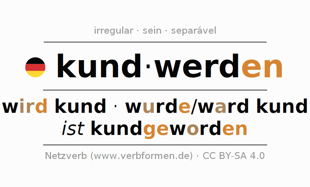 O verbo kundwerden é totalmente conjugado em todas as pessoas e números no Particípio Presente Perfeito