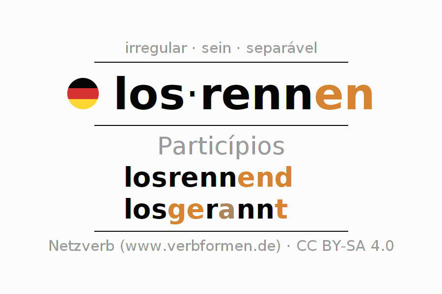 O verbo losrennen é totalmente conjugado em todas as pessoas e números no Particípio Presente Perfeito