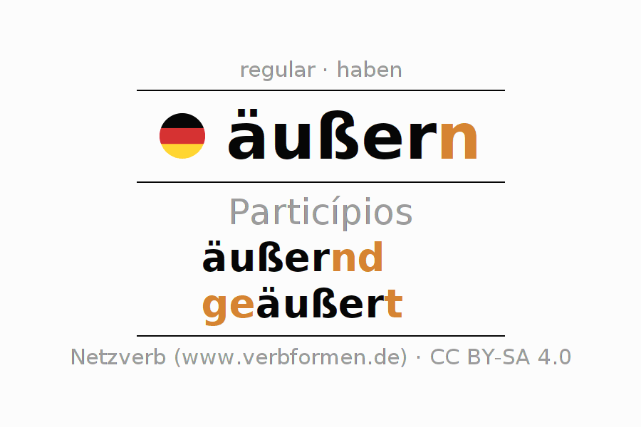 A conjugação do verbo äußern no Ativo Particípio Presente Perfeito palavra discurso é: äußernd, geäußert.A formação dessas formas segue determinadas regras gramaticais. Os requisitos para a conjugação do verbo como forma verbal simples no äußern do Particípio. Comentários ☆