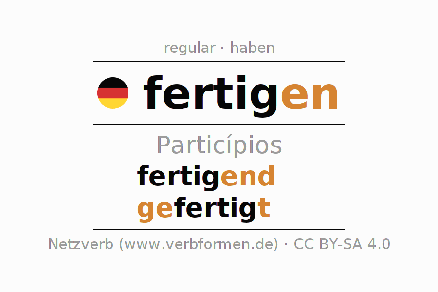 O verbo fertigen é totalmente conjugado em todas as pessoas e números no Particípio Presente Perfeito