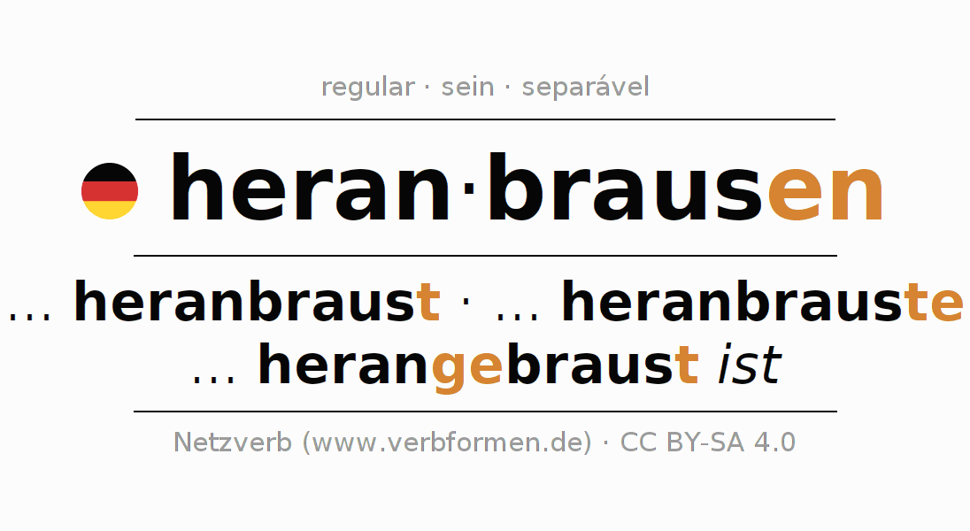 O verbo heranbrausen é totalmente conjugado em todas as pessoas e números no Particípio Presente Perfeito