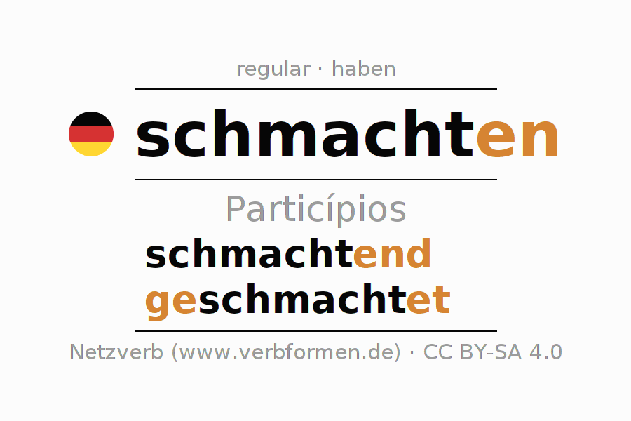 A conjugação do verbo schmachten no Ativo Particípio Presente Perfeito palavra discurso é: schmachtend, geschmachtet.A formação dessas formas segue determinadas regras gramaticais. Os requisitos para a conjugação do verbo como forma verbal simples no schmachten do Particípio. Comentários ☆