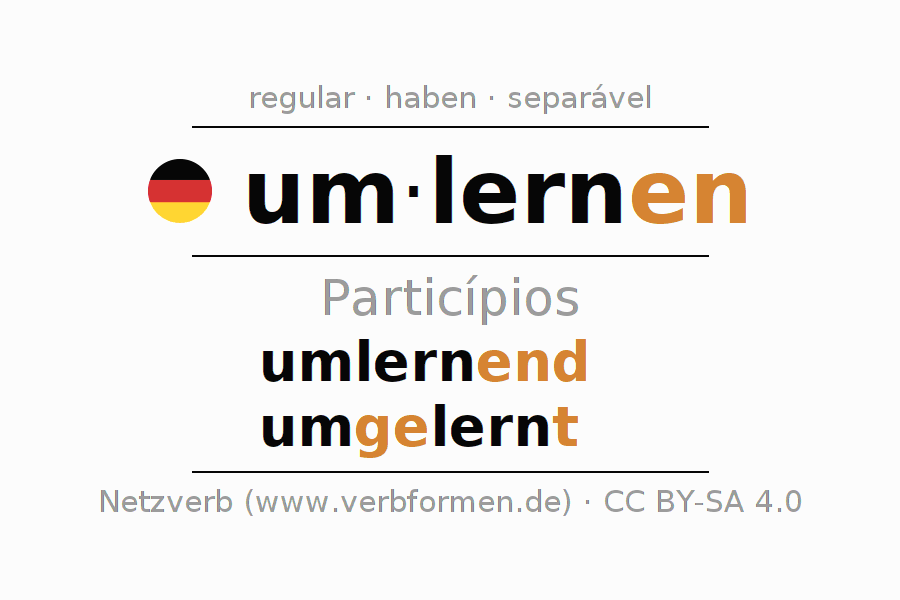 A conjugação do verbo umlernen no Ativo Particípio Presente Perfeito palavra discurso é: umlernend, umgelernt.A formação dessas formas segue determinadas regras gramaticais. Os requisitos para a conjugação do verbo como forma verbal simples no umlernen do Particípio. Comentários ☆